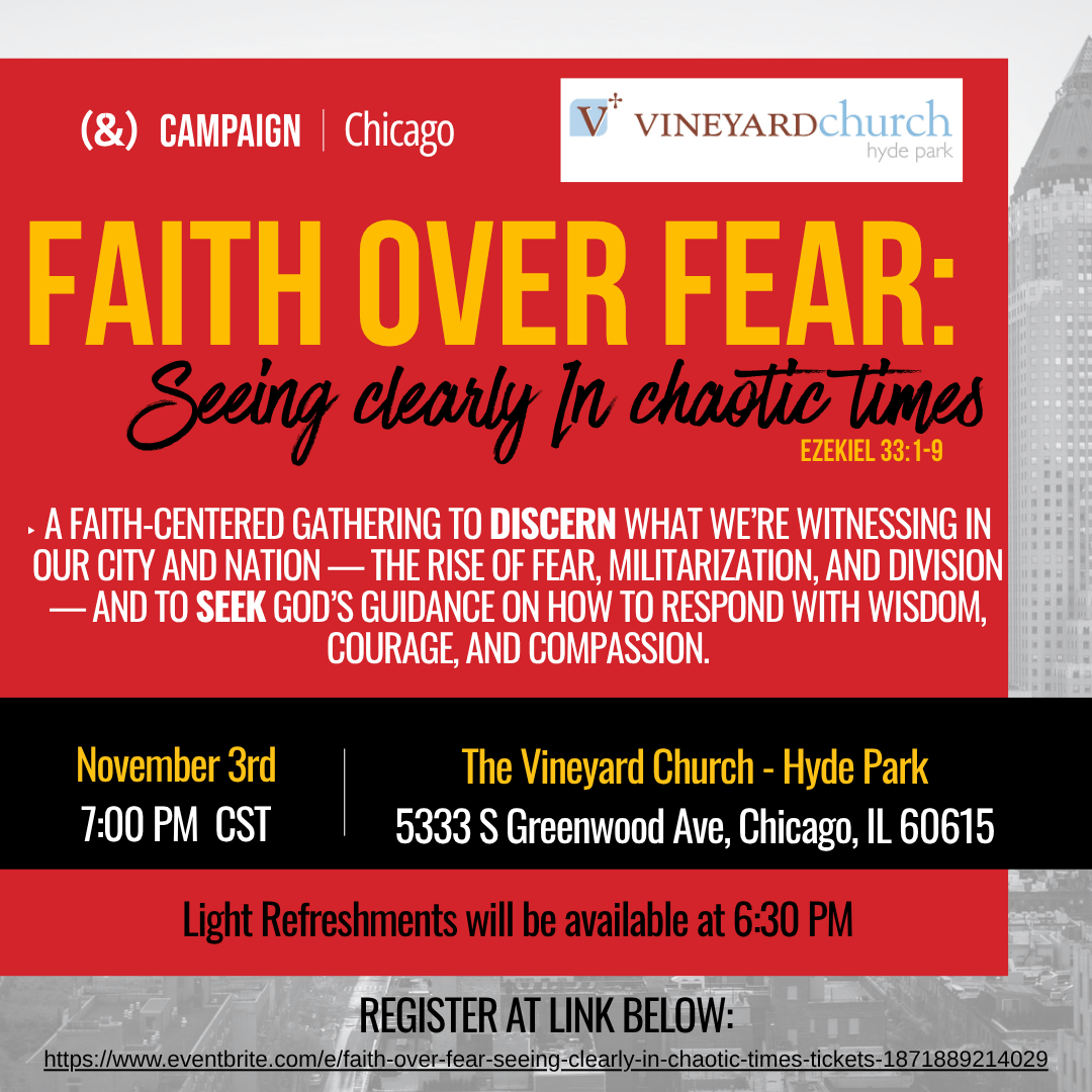 In a time marked by fear, division, and uncertainty, how should people of faith respond? On Monday, November 3rd at 7:00 PM, Vineyard Church – Hyde Park and the (&) Campaign Chicago invite you to a powerful evening titled “Faith Over Fear: Seeing Clearly in Chaotic Times.”
